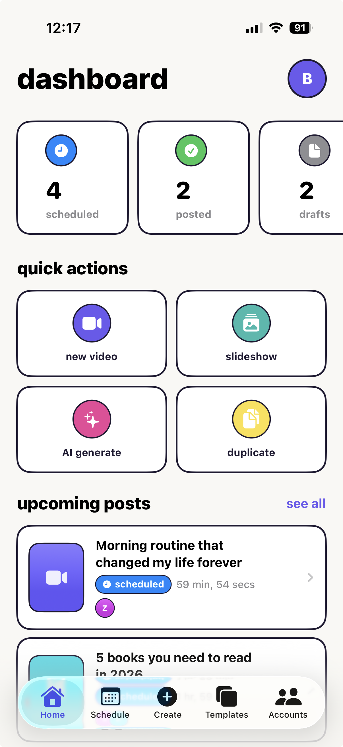 BulkPost app dashboard showing scheduled posts, quick actions, and upcoming posts